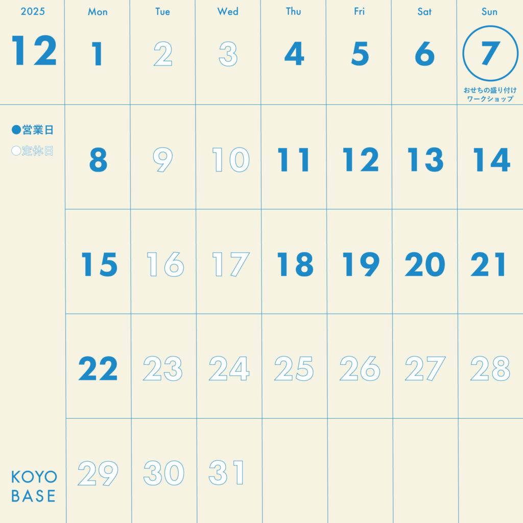 もうすぐ12月にさしかかります。営業カレンダーをご確認ください。